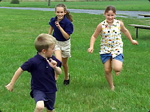 | Le bambine stanno correndo dietro il bambino. | Девочки бегут за мальчиком. | ||