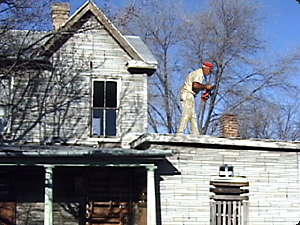 Где мужчина? Мужчина на старом доме (на крыше). |