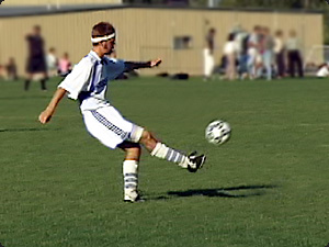 | Il ragazzo in rosso calcia la palla. | Мальчик в красном бьет по мячу. | ||