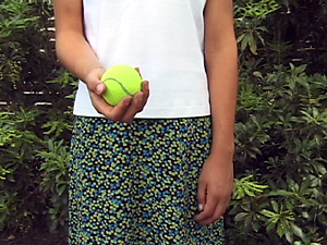 | Una palla gialla è nella sua mano sinistra. | В её левой руке жёлтый мяч. | ||