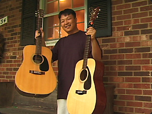 | L’uomo ha una chitarra nella mano destra e una nella mano sinistra. | У мужчины в правой руке гитара, а в левой — другая. | ||