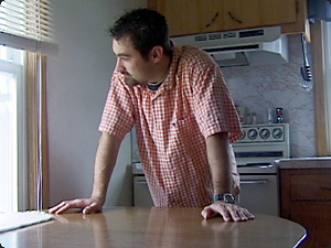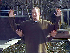 | Una mano è sulla faccia dell’uomo e una è sul suo gomito. | Одна рука лежит на лице мужчины, а другая — на локте. | ||