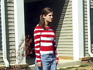 | Lei porta un maglione rosso e bianco. | Она одета в красно-белый свитер. | ||