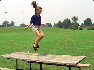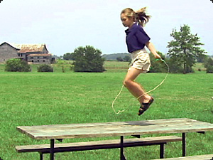 | La bambina sul tavolo sta saltando alla corda. | Девочка на столе прыгает через скакалку. | ||