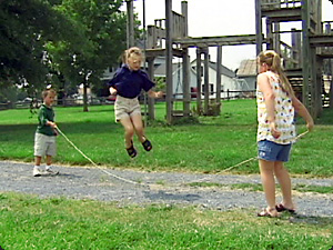 | Il bambino sta girando la corda e la bambina sta saltando. | Мальчик крутит скакалку, а девочка прыгает. | ||