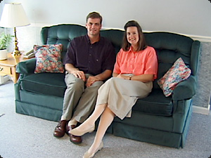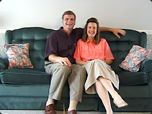 | La donna è seduta accanto a suo marito su un divano. | Женщина сидит рядом со своим мужем на диване. | ||