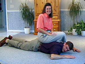 | La moglie dell’uomo è seduta su di lui. | Жена мужчины сидит на нём. | ||