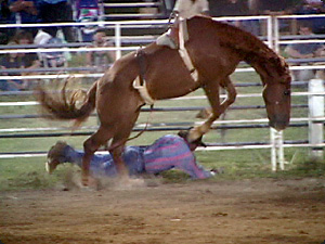 Лошадь сбросила/"дёрнула" ковбоя вниз со спины /принадлеж./ оно /уже/. |