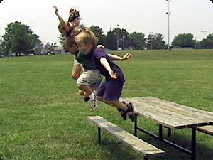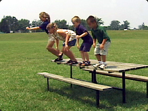 | I bambini saltano dal tavolo. | Дети прыгают вниз (спрыгивают) со стола. | ||