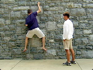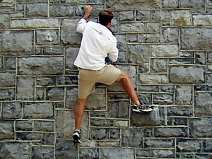 | L’uomo con il blusotto bianco si arrampica sul muro. |