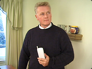 | L’uomo tiene il telefono portatile, ma non lo sta usando. |