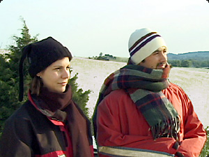 Погода холодная. Люди эти соответственно (поэтому) носят шапку и шарф. |