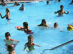 Люди /оба/ /много/ (эти люди) играют /вместе/ в воде когда погода жаркая. |