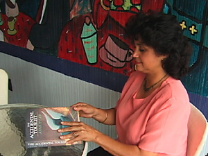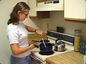 | La donna non sta parlando a nessuno. Sta preparando del cibo. |