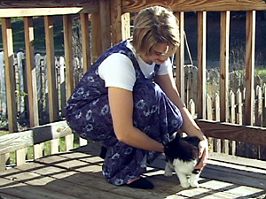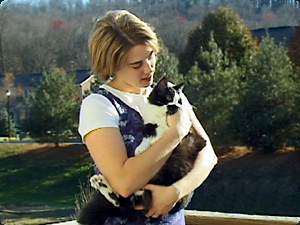 | La donna ha sollevato il gatto e lo sta tenendo in braccio. |