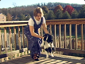 | La donna sta sollevando il gatto. | Женщина /несёт/ кошку поднимает. | ||