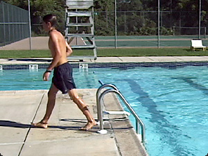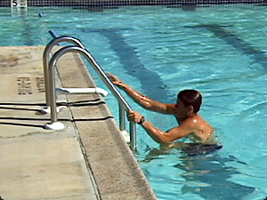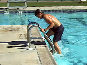 | Il ragazzo sta uscendo dall’acqua. | Мальчик поднимается выходит из воды. | ||