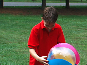 Мальчик, который носит рубашку синюю ловит/"получает" грабли. |