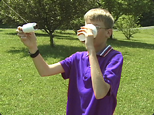 | Il bambino sta bevendo da un bicchiere di carta e sta facendo volare un aquilone. |