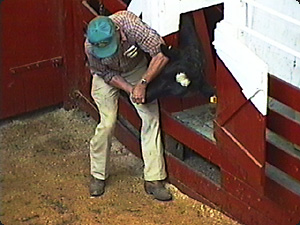 | L’uomo sta cercando di aprire la bocca della mucca. |