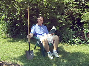 Отец имеет лопату в руке /сторона/ одной и имеет книг"написанное" в руке ещё одной. |