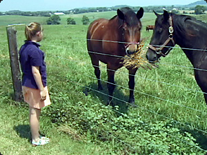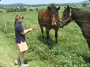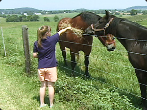 | La bambina sta dando il fieno ai cavalli. | Девочка даёт/распределяет сено /к/даёт/ лошади. | ||