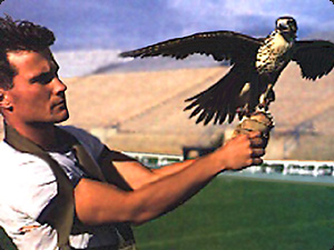 Птица, которая на руке, /принадлеж./ мужчины расправила крылья /уже/. |