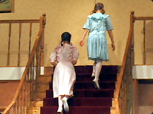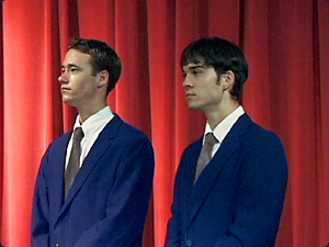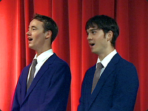 | I ragazzi giovani con gli abiti blu cantano, ma ora non stanno cantando. |