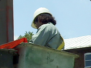 Обычно, рабочие носят каски, но сейчас он не носит каску. |