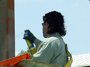 | L’operaio di solito porta un elmetto protettivo, ma ora non ne sta portando uno. |