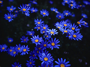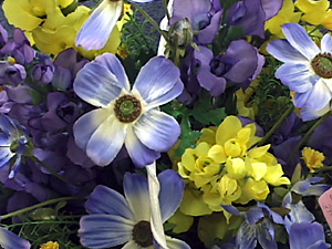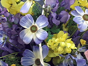 Цветы некоторые /цветы/ /группа/ эти жёлтые а цветы остальные - синие. |