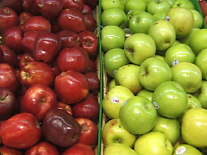 Яблоки, некоторые /фрукты/ красные, и некоторые /фрукты/ зелёные. |