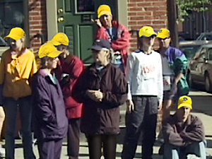 Люди, часть большая (большинство), носят шляпу жёлтую. но имеется человек один, не носит шляпу. |