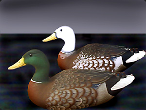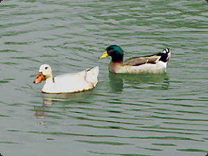 | Una di queste anatre ha una testa bianca e l’altra ha una testa verde. |