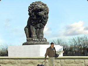 | L’uomo è al di sotto della statua di un leone. | Мужчина под статуей льва? | ||