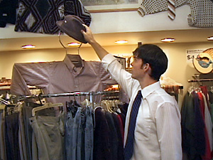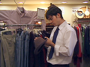 "Мужской парень" достигает /идёт/ брать шляпу (протягивает руку к шляпе) которая над головой его (шляпа где-то вверху). |