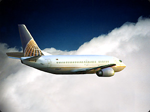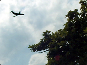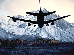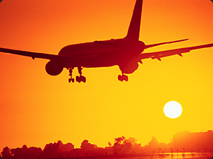 Самолёт летит перед солнцем (на фоне солнца) которое садится/"вниз". |