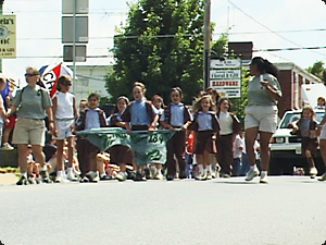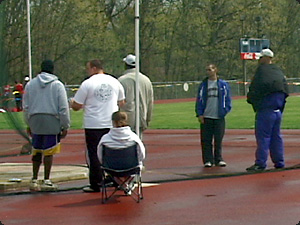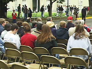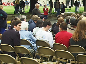 Группа людей стоят /вместе/. Но имеется человек один, сидит. |