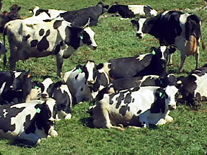 | La maggior parte delle mucche è coricata, ma alcune stanno in piedi. |
