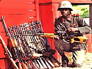 | La maggior parte di queste armi è appoggiata a un muro. |