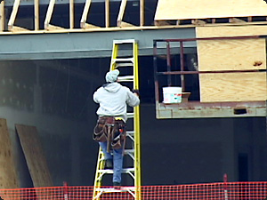 | L’operaio sta salendo la scala a pioli. | Рабочий взбирается поднимается/вверх по лестнице. | ||