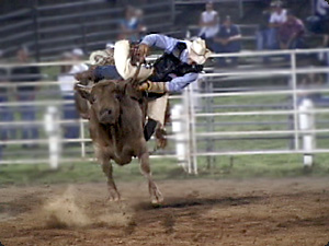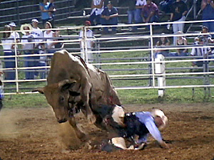 | Il mandriano sta cercando di cavalcare il toro, sta cadendo. |