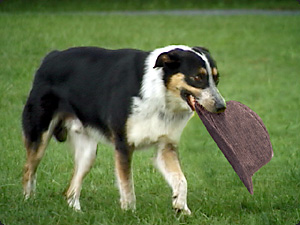 Собака пытается /что/ /будет/ поймает/"получит" диск/фрисби. |