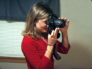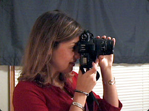| Lei sta usando una macchina fotografica per fare una fotografia. |