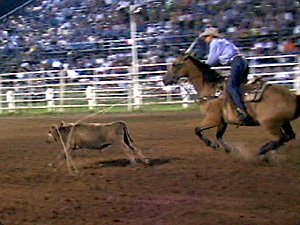 Ковбой использует верёвку чтобы поймать телёнка. |