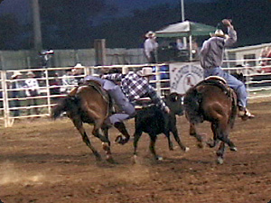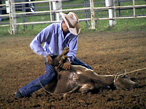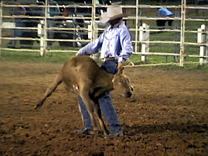 | Il mandriano sta prendendo il vitello senza usare una corda. |