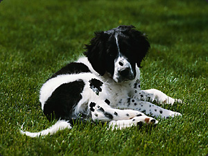 Собака эта имеется пятен много/больше чем собаки прочие. |