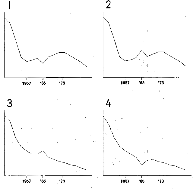 :え、子供の生まれる割合はここ数十年減り傾向にあります。1950年頃から急に下降し、57年から73年にかけてはや