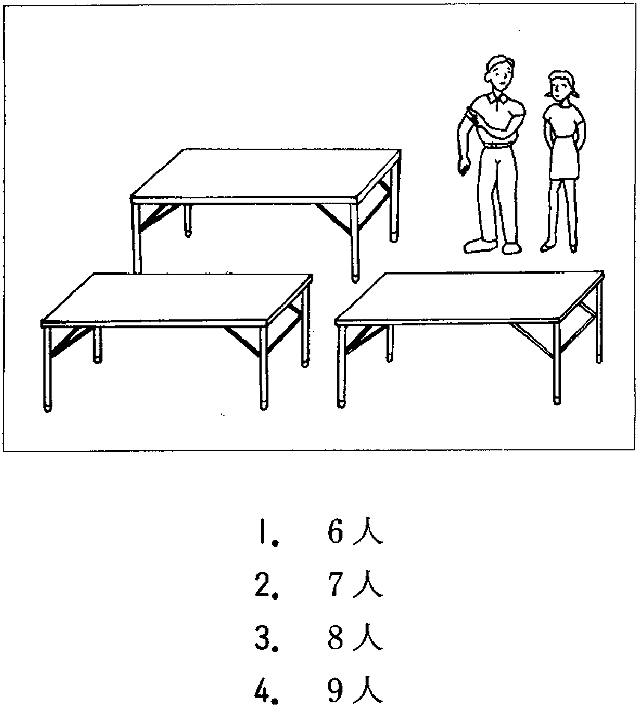 3番 男の人と女の人が机を運びながら話しています。今日は全部で何人来る予定ですか。 男:一つの机には二人ずつ座