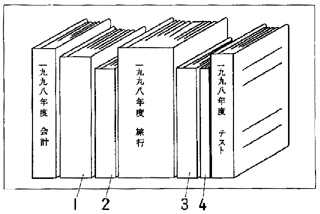 どれですか。 男:ええと、1998年度旅行って書いてある奴の、隣の隣。 女:はい。この薄いのですね。 男:いや。